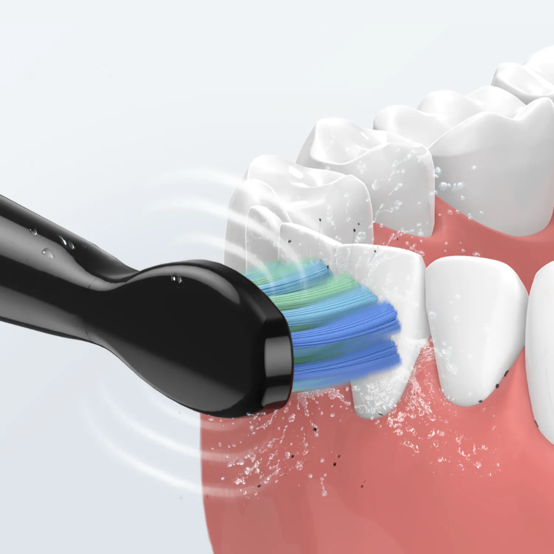 Ainutlaatuinen DuPont™-harjaspää on muotoiltu niin, että vesi ja hammastahna ohjautuvat hampaiden väleihin ja ikenien reunoille hellävaraista ja tehokasta puhdistusta varten.